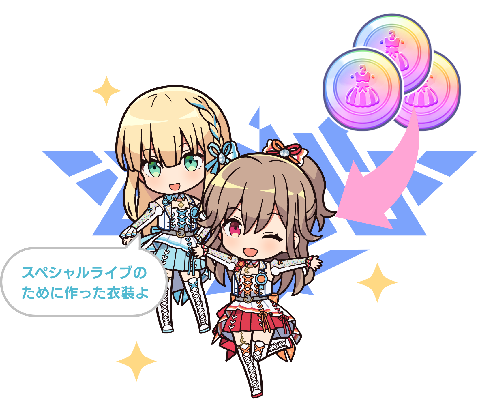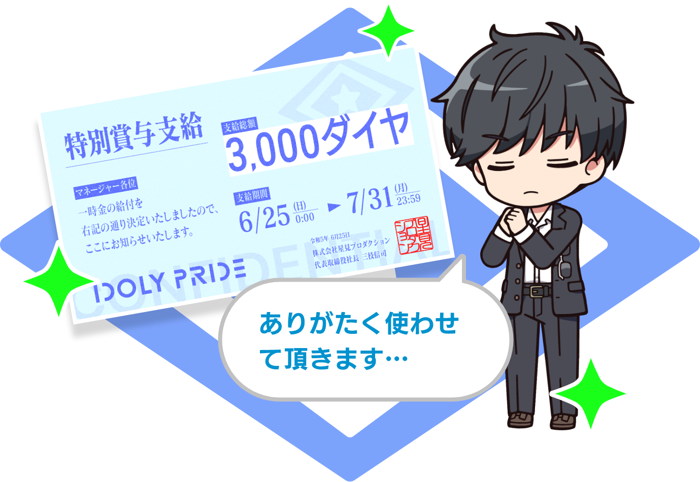 IDOLY PRIDE 2周年記念サイト 好評配信中 好評配信中 1.2周年記念楽曲登場 「友達だよ、いつの日も」 作詞:清竜人 作曲:清竜人 編曲:清竜人 唄:星見プロダクション 2.アイコン&壁紙プレゼント 2周年を記念した新キービジュアル使用 こちらから2周年を記念したSNS用アイコン&スマホ用壁紙をダウンロードいただけます ダウンロード 3.アイドル宣伝プロジェクト 2周年を記念して、マネージャーのみなさまから 担当アイドルの宣伝をTwitterにて募集しました。 こちらから一部をご覧いただけます。 宣伝を見る 4.記念イラスト公開 IDOLY PRIDEイラストチームによる 2周年を記念した特別書き下ろしイラスト。 6 days to go 5 days to go 4 days to go 3 days to go 2 days to go 1 day to go 5.フォトイベント開催 テーマに合ったフォトを撮影してイベントアイドルを手に入れよう 開催期間 6月26日18:00〜7月6日11:59 開催期間 6月26日18:00〜7月6日11:59 6.アイプラフェスガチャ開催 星5アイドルの出現率が2倍 アイプラフェス限定の麻奈と遙子が新登場。 開催期間 6月26日12:00~7月3日11:59 7.プレミアムガチャ開催 特別なシチュエーションイラストが登場 星見プロ所属グループのリーダー5人がシチュエーションイラストになってプレミアムガチャに新登場。 開催期間 6月24日12:00~7月24日11:59 8.引き放題ガチャ 星5アイドル3人以上が確定 さとみがお辞儀をする演出が 出るまで引き放題。 開催期間 6月24日20:00〜7月19日23:59 9. 豪華ログインボーナス 2周年記念衣装が登場 ゲーム内でメダルを受け取って、 2周年記念衣装と交換しよう! 配布期間 6月25日0:00~7月1日23:59 2周年記念特別賞与 マネージャ全員に3000ダイヤプレゼント! 配布期間 6月25日0:00〜7月31日23:59 10. LINEスタンプ発売 ゲーム内でアイドルが使うスタンプが再びLINEスタンプになって登場! 購入する タイトル IDOLY PRIDE(アイドリープライド) 対応OS iOS / Android ジャンル アイドルマネジメントRPG ※基本プレイ無料(一部有料コンテンツがあります) AppleとApple ロゴ、App StoreはApple Inc. の商標です。 Google Play および Google Play ロゴは、Google LLC の商標です。
